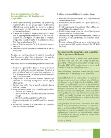 Main weaknesses for effective implementation of LG development cooperation • Donor agency financing programmes are governed by regulations that are not always adapted to the reality of local governments, as they are conceived by donors rather than by LGs. This makes partner ownership and accountability difficult; • The practice of preferred budget support by donor agencies in applying the recommendations of the Paris Declaration and Accra Agenda for Action leads to recentralising public budgets in spite of decentralisation laws. This threatens local ownership; • Lack of financial resources for LG development cooperation; and • Inadequate legal framework for cooperation at the national level. The above are mainly problems with national financial and legal frameworks, rather than weaknesses in the way LGs work. Donors are called on to look into these issues. Weaknesses that can be addressed by LGs themselves include: • Most of the partnerships between local governments don’t use sufficient systematic approach. Therefore, a concentration of partners in some local government exists, whereas others lack of support or don’t have partners that support them; • The priorities of the “southern” partners are not always achieved. The ownership of programmes remains a point of discussion; • Partners may suffer from a lack of continuity due to political changes; • Many partnerships suffer from a lack of professionalism: »» Too little focus on results »» The work and results are not strategic or transferable enough »» Monitoring and evaluation is insufficient; • Many partnerships do not benefit from citizen support; and • Partnerships between local governments lack coordination and remain fragmented.