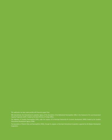 This publication has been made possible with financial support from: VNG International, the International Co-operation Agency of the Association of the Netherlands Municipalities (VNG) in the framework of its Local Government Capacity Programme (LGCP), funded by the Dutch Ministry of Foreign Affairs. The Federation of Canadian Municipalities (FCM), under the auspices of its Municipal Partnership for Economic Development (MPED) funded by the Canadian International Development Agency (CIDA). The Association of Flemish Cities and Municipalities (VVSG), through its program on Municipal International Cooperation supported by the Belgian Development Cooperation.