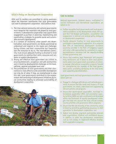 UCLG’s Policy on Development Cooperation UCLG and its members are committed to raising awareness about the important contribution that local governments can make to development cooperation. UCLG believes that: 1. The international community and national governments must recognise the important role played by local governments in development cooperation and support their engagement as partners in planning, implementing and coordinating strategies to promote social and sustainable economic development; 2. In a context of increasing urban growth and decentralisation, local governments are ideally positioned to understand and respond to the needs and challenges facing citizens and their communities but frequently lack the resources to do so. The international community must ensure adequate funding is directed to local governments to mobilise their skills, resources and networks to support development; 3. Strong and effective local government are critical to ensuring democratic, prosperous and safe communities and in resolving developmental challenges at the local, national, regional and global level; and 4. The contribution of local governments and their associations to more effective and sustainable development can only be of value if they are strengthened to play this role. Local governments contribute to the empowerment and ownership of development initiatives by local communities leading to enhanced sustainability of development cooperation.