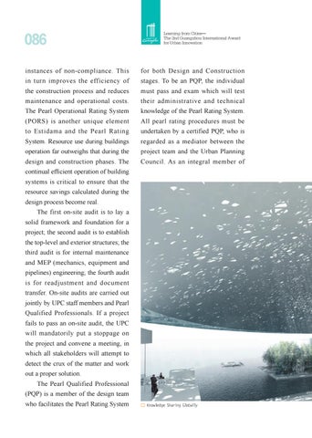 continual efficient operation of building systems is critical to ensure that the resource savings calculated during the design process become real. The first on-site audit is to lay a solid framework and foundation for a project; the second audit is to establish the top-level and exterior structures; the third audit is for internal maintenance and MEP (mechanics, equipment and pipelines) engineering; the fourth audit is for readjustment and document transfer. On-site audits are carried out jointly by UPC staff members and Pearl Qualified Professionals. If a project fails to pass an on-site audit, the UPC will mandatorily put a stoppage on the project and convene a meeting, in which all stakeholders will attempt to detect the crux of the matter and work out a proper solution. The Pearl Qualified Professional (PQP) is a member of the design team who facilitates the Pearl Rating System