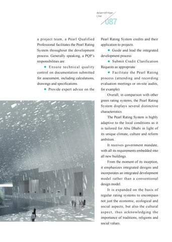 for example) Overall, in comparison with other green rating systems, the Pearl Rating System displays several distinctive characteristics. The Pearl Rating System is highly adaptive to the local conditions as it is tailored for Abu Dhabi in light of its unique climate, culture and reform ambition. It receives government mandate, with all its requirements embedded into all new buildings. From the moment of its inception, it emphasizes integrated designs and incorporates an integrated development model rather than a conventional design model. It is expanded on the basis of regular rating systems to encompass not just the economic, ecological and social aspects, but also the cultural aspect, thus acknowledging the importance of traditions, religions and social values.