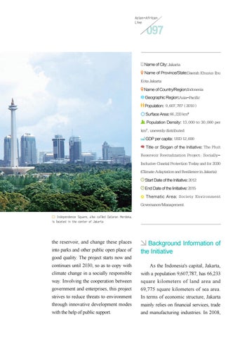 Name of City: Jakarta Name of Province/State:Daerah Khusus Ibu Kota Jakarta Name of Country/Region:Indonesia Geographic Region:Asia-Pacific Population: 9,607,787(2010) Surface Area: 66,233 km² Population Density: 13,000 to 30,000 per km2, unevenly distributed GDP per capita: USD 12,600 Title or Slogan of the Initiative: The Pluit Reservoir Revitalization Project: SociallyInclusive Coastal Protection Today and for 2030 (Climate Adaptation and Resilience in Jakarta) Start Date of the Initiative: 2012 End Date of the Iinitiative: 2015 Thematic Area: Society Environment Governance/Management □ Independence Square, also called Dataran Merdeka, is located in the center of Jakarta