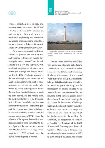 finance, stockholding company and business services accounted for 29% of Jakarta's GDP. Due to the electronics, a u t o m a t i o n , c h e m i c a l i n d u s t r y, mechanical engineering and biomedical industries, manufacturing industries are very diverse in Jakarta. At present, Jakarta’s GDP per capita is USD 12,600. As to the geographical conditions, Jakarta, the junction of South-East Asia