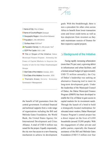 a limited annual budget (of approximately USD 75 million annually), the City of Dakar’s leadership was seeking an alternative financing tool to meet its long-term development goals. Under the leadership of the Municipal Council of Dakar, the Dakar Municipal Finance Program (DMFP) has been developed to enable the City of Dakar to gain access to
