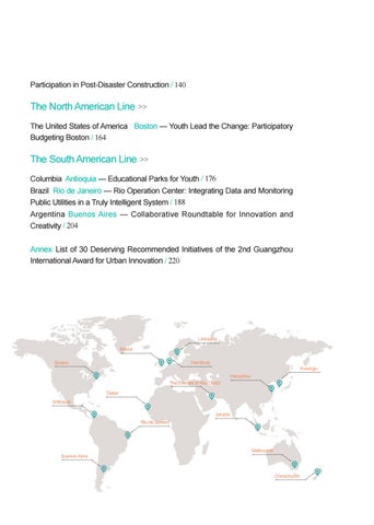 The South American Line >> Columbia Antioquia — Educational Parks for Youth / 176 Brazil Rio de Janeiro — Rio Operation Center: Integrating Data and Monitoring Public Utilities in a Truly Intelligent System / 188 Argentina Buenos Aires — Collaborative Roundtable for Innovation and Creativity / 204 Annex: List of 30 Deserving Recommended Initiatives of the 2nd Guangzhou International Award for Urban Innovation / 220