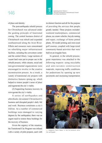 distinctive features sprang up, which helped to restore people’s sense of place and regenerate the city’s vitality. (3) Supporting business recovery to reinvigorate the city’s vitality A series of earthquakes and aftershocks devastated Christchurch’s business and disrupted people’s daily life and work. Business constitutes a city’s lifeline. As a number of commercial buildings were damaged to varying degrees by the earthquakes, there was an urgent need to restore these buildings for the recovery of business. Given the urgency of the situation, the Transitional City Program was infused with a variety of pilot projects, each with