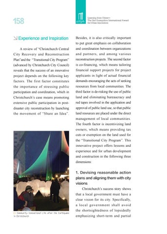 Christchurch’s success story shows that a local government must have a clear vision for its city. Specifically, a local government shall avoid □ Community Innovational Life after the Earthquake in Christchurch