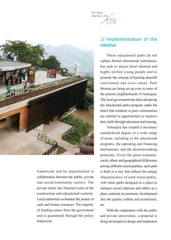 Implementation of the Initiative These educational parks do not replace formal educational institutions, but seek to attract local talented and highly-skilled young people and to promote the concept of learning peaceful coexistence and civic values. Park libraries are being set up even in some of the poorest neighborhoods of Antioquia. The local government has been advancing the educational parks program under the belief that residents in poor communities are entitled to opportunities to improve their skills through education and training. Antioquia has created a necessary standardized degree in a wide range of areas, including in the educational programs, the operating and financing mechanisms, and the decision-making processes. Given the great economic, social, ethnic and geographical differences among different municipalities, each park framework and be implemented in