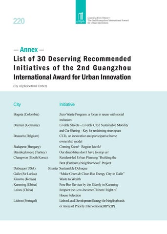 — Annex — List of 30 Deserving Recommended Initiatives of the 2nd Guangzhou International Award for Urban Innovation (By Alphabetical Order)