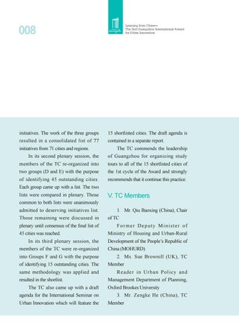 V. TC Members 1. Mr. Qiu Baoxing (China), Chair of TC Former Deputy Minister of Ministry of Housing and Urban-Rural Development of the People’s Republic of China (MOHURD) 2. Ms. Sue Brownill (UK), TC Member Reader in Urban Policy and Management Department of Planning, Oxford Brookes University 3. Mr. Zengke He (China), TC Member