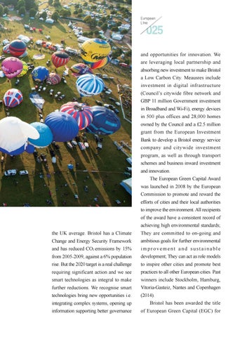 and opportunities for innovation. We are leveraging local partnership and absorbing new investment to make Bristol a Low Carbon City. Meausres include investment in digital infrastructure (Council’s citywide fibre network and GBP 11 million Government investment in Broadband and Wi-Fi), energy devices in 500 plus offices and 28,000 homes owned by the Council and a £2.5 million grant from the European Investment Bank to develop a Bristol energy service company and citywide investment program, as well as through transport schemes and business inward investment and innovation. The European Green Capital Award was launched in 2008 by the European Commission to promote and reward the efforts of cities and their local authorities to improve the environment. All recipients of the award have a consistent record of achieving high environmental standards; the UK average. Bristol has a Climate