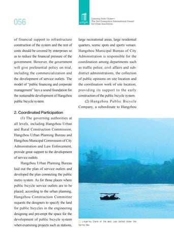 (1) The governing authorities at all levels, including Hangzhou Urban and Rural Construction Commission, Hangzhou Urban Planning Bureau and Hangzhou Municipal Commission of City Administration and Law Enforcement, provide great support to the development of service outlets. Hangzhou Urban Planning Bureau laid out the plan of service outlets and developed the plan connecting the public metro system. As for those places where public bicycle service outlets are to be placed, according to the urban planning, Hangzhou Construction Committee requests the designers to specify the land for public bicycles in the engineering designing and pre-empt the space for the development of public bicycle system when examining projects such as stations,