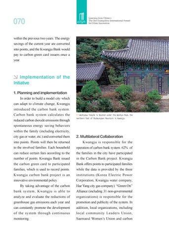 In order to build a model city which can adapt to climate change, Kwangju introduced the carbon bank system. Carbon bank system calculates the reduced carbon dioxide emissions through
