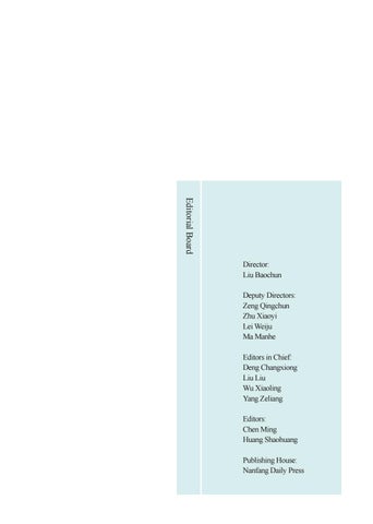 Editorial Board Director: Liu Baochun Deputy Directors: Zeng Qingchun Zhu Xiaoyi Lei Weiju Ma Manhe Editors in Chief: Deng Changxiong Liu Liu Wu Xiaoling Yang Zeliang Editors: Chen Ming Huang Shaohuang Publishing House: Nanfang Daily Press