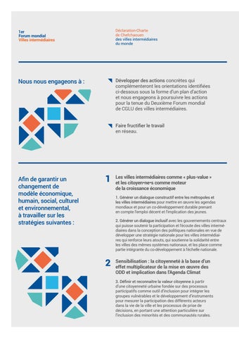 Les villes intermédiaires comme « plus-value » et les citoyen•ne•s comme moteur de la croissance économique 1. Générer un dialogue constructif entre les métropoles et les villes intermédiaires pour mettre en œuvre les agendas mondiaux et pour un co-développement durable prenant en compte l’emploi décent et l’implication des jeunes. 2. Générer un dialogue inclusif avec les gouvernements centraux qui puisse soutenir la participation et l’écoute des villes intermédiaires dans la conception des politiques nationales en vue de développer une stratégie nationale pour les villes intermédiaires qui renforce leurs atouts, qui soutienne la solidarité entre les villes des mêmes systèmes nationaux, et les place comme partie intégrante du co-développement à l’échelle nationale.