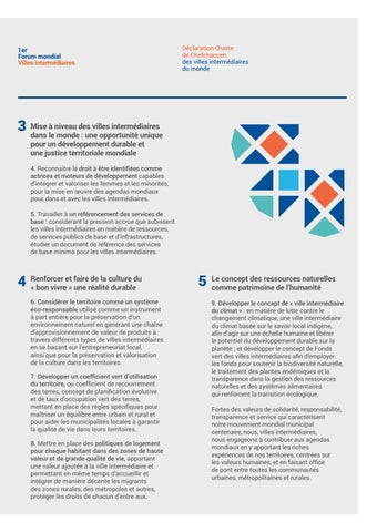 Le concept des ressources naturelles comme patrimoine de l’humanité 9. Développer le concept de « ville intermédiaire du climat » : en matière de lutte contre le changement climatique, une ville intermédiaire du climat basée sur le savoir local indigène, afin d’agir sur une échelle humaine et libérer le potentiel du développement durable sur la planète ; et développer le concept de Fonds vert des villes intermédiaires afin d'employer les fonds pour soutenir la biodiversité naturelle, le traitement des plantes endémiques et la transparence dans la gestion des ressources naturelles et des systèmes alimentaires qui renforcent la transition écologique. Fortes des valeurs de solidarité, responsabilité, transparence et service qui caractérisent notre mouvement mondial municipal centenaire, nous, villes intermédiaires, nous engageons à contribuer aux agendas mondiaux en y apportant les riches expériences de nos territoires, centrées sur les valeurs humaines, et en faisant office de pont entre toutes les communautés urbaines, métropolitaines et rurales.