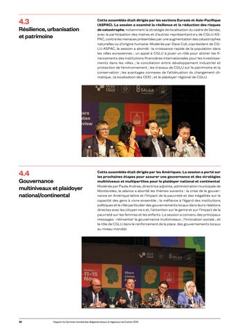 Cette assemblée était dirigée par les Amériques. La session a porté sur les prochaines étapes pour assurer une gouvernance et des stratégies multiniveaux et multipartites pour le plaidoyer national et continental. Modérée par Paola Andrea, directrice adjointe, administration municipale de Montevideo, la séance a abordé les thèmes suivants : la crise de la gouvernance en Amérique latine et l’impact de la pauvreté et des inégalités sur la capacité des gens à vivre ensemble ; la méfiance à l’égard des institutions politiques et le rôle particulier des gouvernements locaux dans leurs relations directes avec les citoyen·ne·s et, l’attention sur le genre et sur l’impact de la pauvreté sur les femmes et les enfants. La session a convenu des principaux messages : réinventer la gouvernance multiniveaux ; l’innovation sociale ; et le rôle de CGLU dans le renforcement de la place des gouvernements locaux au niveau mondial.