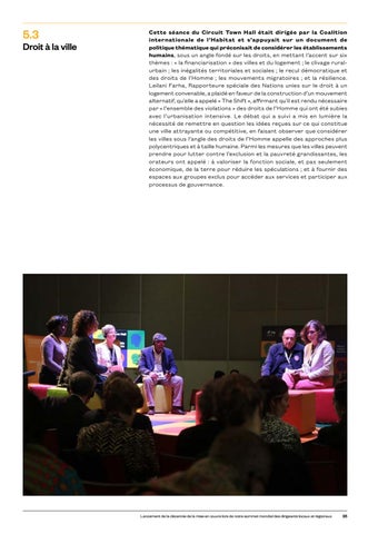 Cette séance du Circuit Town Hall était dirigée par la Coalition internationale de l’Habitat et s’appuyait sur un document de politique thématique qui préconisait de considérer les établissements humains, sous un angle fondé sur les droits, en mettant l’accent sur six thèmes : « la financiarisation » des villes et du logement ; le clivage ruralurbain ; les inégalités territoriales et sociales ; le recul démocratique et des droits de l’Homme ; les mouvements migratoires ; et la résilience. Leilani Farha, Rapporteure spéciale des Nations unies sur le droit à un logement convenable, a plaidé en faveur de la construction d’un mouvement alternatif, qu’elle a appelé « The Shift », affirmant qu’il est rendu nécessaire par « l’ensemble des violations » des droits de l’Homme qui ont été subies avec l’urbanisation intensive. Le débat qui a suivi a mis en lumière la nécessité de remettre en question les idées reçues sur ce qui constitue une ville attrayante ou compétitive, en faisant observer que considérer les villes sous l’angle des droits de l’Homme appelle des approches plus polycentriques et à taille humaine. Parmi les mesures que les villes peuvent prendre pour lutter contre l’exclusion et la pauvreté grandissantes, les orateurs ont appelé : à valoriser la fonction sociale, et pas seulement économique, de la terre pour réduire les spéculations ; et à fournir des espaces aux groupes exclus pour accéder aux services et participer aux processus de gouvernance.