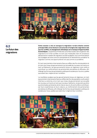 Cette session a mis en exergue la migration rurale-urbaine comme principal défi, et les facteurs structurels à l’origine des migrations tels que les conflits, le changement climatique et le manque d’opportunités économiques. L’expérience limitée des autorités locales dans la gestion des migrations et le fait qu’elles ne sont pas impliquées dans le processus décisionnel en matière de migration ont été soulignés, tout comme le besoin de stratégies de lutte contre la xénophobie et la nécessité de considérer la migration comme une opportunité et non pas comme un problème. En tant que premiers intervenants face aux effets des flux de population et en tant que niveau de gouvernement qui accueille les nouveaux arrivants en tant qu’habitants, les gouvernements locaux et régionaux sont prêts à contribuer au renforcement de partenariats pluralistes et efficaces, afin d’élargir les formes de participation politique et sociale pour tou·te·s, quelles que soient leur origine et leur condition. Le manifeste souligne que les gouvernements locaux et régionaux, en tant que premiers intervenants face aux effets des flux de population, qu’ils soient internes ou externes, et en tant que niveau de gouvernement qui accueille les nouveaux arrivants en tant que nouveaux habitants, ne peuvent pas être que de simples partenaires de la mise en œuvre. Ils sont prêts à contribuer, par leurs expériences et leurs valeurs, au renforcement de partenariats pluralistes et efficaces, afin d’élargir les formes de participation politique et sociale pour tous, quelles que soient leur origine et leur condition.