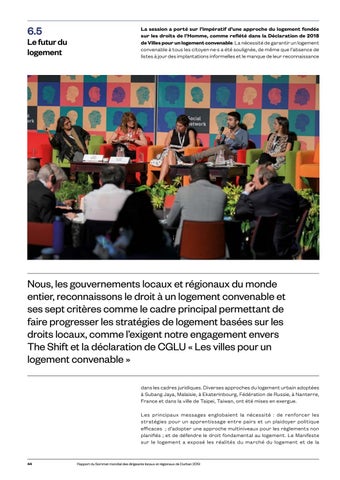 Nous, les gouvernements locaux et régionaux du monde entier, reconnaissons le droit à un logement convenable et ses sept critères comme le cadre principal permettant de faire progresser les stratégies de logement basées sur les droits locaux, comme l’exigent notre engagement envers The Shift et la déclaration de CGLU « Les villes pour un logement convenable » dans les cadres juridiques. Diverses approches du logement urbain adoptées à Subang Jaya, Malaisie, à Ekaterinbourg, Fédération de Russie, à Nanterre, France et dans la ville de Taipei, Taiwan, ont été mises en exergue. Les principaux messages englobaient la nécessité : de renforcer les stratégies pour un apprentissage entre pairs et un plaidoyer politique efficaces ; d’adopter une approche multiniveaux pour les règlements non planifiés ; et de défendre le droit fondamental au logement. Le Manifeste sur le logement a exposé les réalités du marché du logement et de la