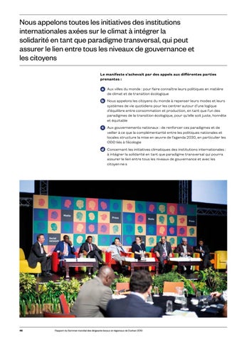 Nous appelons toutes les initiatives des institutions internationales axées sur le climat à intégrer la solidarité en tant que paradigme transversal, qui peut assurer le lien entre tous les niveaux de gouvernance et les citoyens Le manifeste s’achevait par des appels aux différentes parties prenantes :
