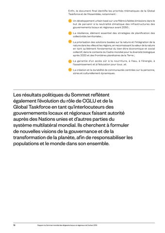 Enfin, le document final identifie les priorités thématiques de la Global Taskforce et de l’Assemblée, notamment : Un développement urbain basé sur une filière à faibles émissions dans le but de parvenir à la neutralité climatique des infrastructures des gouvernements locaux et régionaux avant 2050 ; La résilience, élément essentiel des stratégies de planification des collectivités territoriales ; La priorisation des solutions basées sur la nature et l’intégration de la nature dans les villes et les régions, en reconnaissant la valeur de la nature en tant qu’élément fondamental du bien-être économique et social collectif, dans le contexte du Cadre mondial pour la diversité biologique après 2020 et des frontières planétaires de la Terre ; La garantie d’un accès sûr à la nourriture, à l’eau, à l’énergie, à l’assainissement et à l’éducation pour tous ; et La création et la durabilité de communautés centrées sur la personne, sûres et culturellement dynamiques.