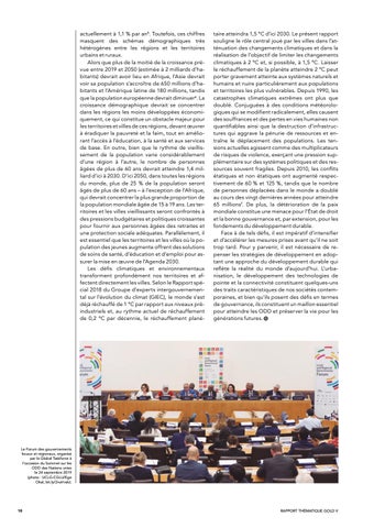 actuellement à 1,1 % par an5. Toutefois, ces chiffres masquent des schémas démographiques très hétérogènes entre les régions et les territoires urbains et ruraux. Alors que plus de la moitié de la croissance prévue entre 2019 et 2050 (estimée à 2 milliards d’habitants) devrait avoir lieu en Afrique, l’Asie devrait voir sa population s’accroître de 650 millions d’habitants et l’Amérique latine de 180 millions, tandis que la population européenne devrait diminuer6. La croissance démographique devrait se concentrer dans les régions les moins développées économiquement, ce qui constitue un obstacle majeur pour les territoires et villes de ces régions, devant œuvrer à éradiquer la pauvreté et la faim, tout en améliorant l’accès à l’éducation, à la santé et aux services de base. En outre, bien que le rythme de vieillissement de la population varie considérablement d’une région à l’autre, le nombre de personnes âgées de plus de 60 ans devrait atteindre 1,4 milliard d’ici à 2030. D’ici 2050, dans toutes les régions du monde, plus de 25 % de la population seront âgés de plus de 60 ans – à l’exception de l’Afrique, qui devrait concentrer la plus grande proportion de la population mondiale âgée de 15 à 19 ans. Les territoires et les villes vieillissants seront confrontés à des pressions budgétaires et politiques croissantes pour fournir aux personnes âgées des retraites et une protection sociale adéquates. Parallèlement, il est essentiel que les territoires et les villes où la population des jeunes augmente offrent des solutions de soins de santé, d’éducation et d’emploi pour assurer la mise en œuvre de l’Agenda 2030. Les défis climatiques et environnementaux transforment profondément nos territoires et affectent directement les villes. Selon le Rapport spécial 2018 du Groupe d’experts intergouvernemental sur l’évolution du climat (GIEC), le monde s’est déjà réchauffé de 1 °C par rapport aux niveaux préindustriels et, au rythme actuel de réchauffement de 0,2 °C par décennie, le réchauffement plané-