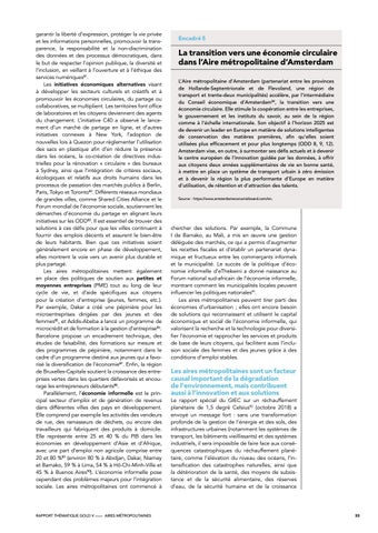 Les aires métropolitaines sont un facteur causal important de la dégradation de l’environnement, mais contribuent aussi à l’innovation et aux solutions Le rapport spécial du GIEC sur un réchauffement planétaire de 1,5 degré Celsius92 (octobre 2018) a envoyé un message fort : sans une transformation profonde de la gestion de l’énergie et des sols, des infrastructures urbaines (notamment les systèmes de transport, les bâtiments vieillissants) et des systèmes industriels, il sera impossible de faire face aux conséquences catastrophiques du réchauffement planétaire, comme l’élévation du niveau des océans, l’intensification des catastrophes naturelles, ainsi que la détérioration de la santé, des moyens de subsistance et de la sécurité alimentaire, des réserves d’eau, de la sécurité humaine et de la croissance