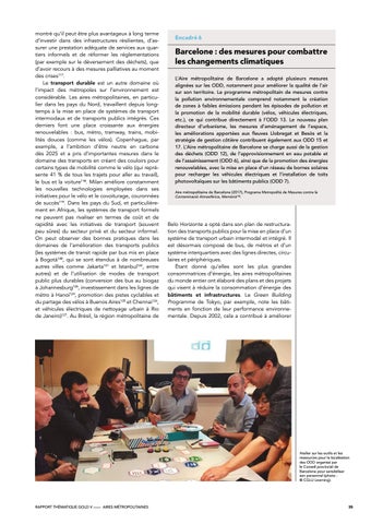 montré qu’il peut être plus avantageux à long terme d’investir dans des infrastructures résilientes, d’assurer une prestation adéquate de services aux quartiers informels et de réformer les réglementations (par exemple sur le déversement des déchets), que d’avoir recours à des mesures palliatives au moment des crises117. Le transport durable est un autre domaine où l’impact des métropoles sur l’environnement est considérable. Les aires métropolitaines, en particulier dans les pays du Nord, travaillent depuis longtemps à la mise en place de systèmes de transport intermodaux et de transports publics intégrés. Ces derniers font une place croissante aux énergies renouvelables : bus, métro, tramway, trains, mobilités douces (comme les vélos). Copenhague, par exemple, a l’ambition d’être neutre en carbone dès 2025 et a pris d’importantes mesures dans le domaine des transports en créant des couloirs pour certains types de mobilité comme le vélo (qui représente 41 % de tous les trajets pour aller au travail), le bus et la voiture118. Milan améliore constamment les nouvelles technologies employées dans ses initiatives pour le vélo et le covoiturage, couronnées de succès119. Dans les pays du Sud, et particulièrement en Afrique, les systèmes de transport formels ne peuvent pas rivaliser en termes de coût et de rapidité avec les initiatives de transport (souvent peu sûres) du secteur privé et du secteur informel. On peut observer des bonnes pratiques dans les domaines de l’amélioration des transports publics (les systèmes de transit rapide par bus mis en place à Bogotá120, qui se sont étendus à de nombreuses autres villes comme Jakarta121 et Istanbul122, entre autres) et de l’utilisation de modes de transport public plus durables (conversion des bus au biogaz à Johannesburg123, investissement dans les lignes de métro à Hanoï124, promotion des pistes cyclables et du partage des vélos à Buenos Aires125 et Chennai126, et véhicules électriques de nettoyage urbain à Rio de Janeiro)127. Au Brésil, la région métropolitaine de