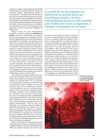 (Usquare) en quartier inclusif, habité par des familles et des étudiants et combinant efficacité, patrimoine, économie circulaire, développement durable et connaissances150 ; et à Sydney avec le Green Square, qui a subi une transformation profonde pour devenir une communauté vivante et intégrée au tissu urbain, dotée d’équipements durables, de réseaux de transport, d’espaces publics, de logements de qualité, de commerces, services et emplois, avec une empreinte environnementale minime151. Dans les pays en développement, ce type de démarche stratégique est encore limité. Presque toutes les aires métropolitaines accueillent un nombre croissant de personnes migrantes, internes ou internationales. Les migrants sont l’un des groupes les plus vulnérables mentionnés dans l’Agenda 2030, les femmes migrantes étant particulièrement vulnérables. Leur qualité de vie est déterminée en grande partie par les politiques locales. Les villes jouent un rôle essentiel pour garantir l’intégration sociale des personnes migrantes et faciliter leur accès au logement, à l’emploi, à l’éducation et à la santé. L’augmentation du nombre de migrants ainsi que leur diversité ne concernent cependant pas uniquement les aires métropolitaines, mais aussi les villes de plus petite taille152. Chengdu a mis en place, en ce sens, une plateforme qui permet aux migrants d’exprimer leurs préoccupations au niveau communautaire, notamment en ce qui concerne l’allocation des ressources publiques153. La municipalité du Grand Amman élabore des politiques visant à réduire les tensions socio-culturelles et la ségrégation spatiale entre les communautés d’accueil et de personnes réfugiées dans le district de Badr Nazzai, dans le sud de la ville154. Pour promouvoir l’inclusion sociale, lutter contre la pauvreté et favoriser l’emploi, les aires métropolitaines doivent également s’occuper des questions relatives à la sécurité (ODD 11.7), en particulier en Amérique latine, mais aussi en Afrique du Sud et aux États-Unis. Selon le rapport annuel sur les cinquante villes les plus dangereuses, quarantetrois d’entre elles se trouvent en Amérique latine, quatre aux États-Unis et trois en Afrique du Sud155. En Afrique, l’agitation civile, l’instabilité politique et le terrorisme, sont une source de préoccupation dans des métropoles telles qu’Addis-Abeba, Johannesburg et Nairobi156, tandis qu’en Amérique latine l’insécurité est surtout causée par les crimes liés au trafic de drogue, les gangs de jeunes et la violence institutionnelle157. Afin de lutter contre l’insécurité, de nombreuses villes ont adopté des démarches participatives pour élaborer des stratégies qui ont donné des résultats encourageants (par exemple Medellín et Séoul), en ciblant les quartiers en difficulté, en impliquant les communautés, les écoles, la police et les districts, et en sécurisant les espaces publics grâce à des politiques conçues pour les groupes vulnérables tels que les jeunes, les femmes et les personnes âgées158. Depuis la Convention sur l’élimination de toutes les formes de discrimination à l’égard des femmes – CEDAW (1979) et la Convention de Belém do Pará (1994), les Agendas mondiaux ont confirmé qu’il