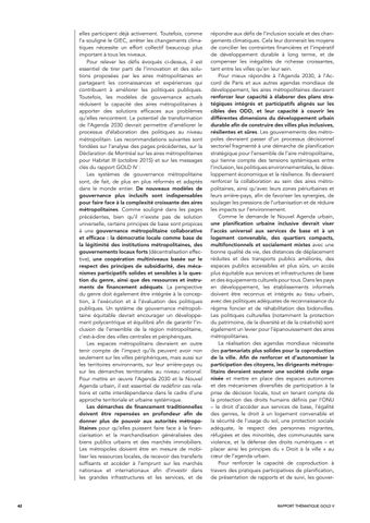 répondre aux défis de l’inclusion sociale et des changements climatiques. Cela leur donnerait les moyens de concilier les contraintes financières et l’impératif de développement durable à long terme, et de compenser les inégalités de richesse croissantes, tant entre les villes qu’en leur sein. Pour mieux répondre à l’Agenda 2030, à l’Accord de Paris et aux autres agendas mondiaux de développement, les aires métropolitaines devraient renforcer leur capacité à élaborer des plans stratégiques intégrés et participatifs alignés sur les cibles des ODD, et leur capacité à couvrir les différentes dimensions du développement urbain durable afin de construire des villes plus inclusives, résilientes et sûres. Les gouvernements des métropoles devraient passer d’un processus décisionnel sectoriel fragmenté à une démarche de planification stratégique pour l’ensemble de l’aire métropolitaine, qui tienne compte des tensions systémiques entre l’inclusion, les politiques environnementales, le développement économique et la résilience. Ils devraient renforcer la collaboration au sein des aires métropolitaines, ainsi qu’avec leurs zones périurbaines et leurs arrière-pays, afin de favoriser les synergies, de soulager les pressions de l’urbanisation et de réduire les impacts sur l’environnement. Comme le demande le Nouvel Agenda urbain, une planification urbaine inclusive devrait viser l’accès universel aux services de base et à un logement convenable, des quartiers compacts, multifonctionnels et socialement mixtes avec une bonne qualité de vie, des distances de déplacement réduites et des transports publics améliorés, des espaces publics accessibles et plus sûrs, un accès plus équitable aux services et infrastructures de base et des équipements culturels pour tous. Dans les pays en développement, les établissements informels doivent être reconnus et intégrés au tissu urbain, avec des politiques adéquates de reconnaissance du régime foncier et de réhabilitation des bidonvilles. Les politiques culturelles (notamment la protection du patrimoine, de la diversité et de la créativité) sont également un levier pour l’épanouissement des aires métropolitaines. La réalisation des agendas mondiaux nécessite des partenariats plus solides pour la coproduction de la ville. Afin de renforcer et d’autonomiser la participation des citoyens, les dirigeants métropolitains devraient soutenir une société civile organisée et mettre en place des espaces autonomes et des mécanismes diversifiés de participation à la prise de décision locale, tout en tenant compte de la protection des droits humains définis par l’ONU – le droit d’accéder aux services de base, l’égalité des genres, le droit à un logement convenable et la sécurité de l’usage du sol, une protection sociale adéquate, le respect des personnes migrantes, réfugiées et des minorités, des communautés sans violence, et la défense des droits numériques – et placer ainsi les principes du « Droit à la ville » au cœur de l’agenda urbain. Pour renforcer la capacité de coproduction à travers des pratiques participatives de planification, de présentation de rapports et de suivi, les gouver-