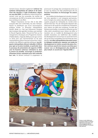 nements locaux devraient également renforcer les systèmes métropolitains de collecte et de traitement des données à l’aide d’indicateurs alignés sur ceux des ODD. Les différents niveaux de gouvernement, ainsi que les universités, les centres de connaissances, les OSC et le secteur privé, devraient tous contribuer à cet effort. Malgré l’importance de leur rôle et des défis auxquels elles sont confrontées, les aires métropolitaines ne bénéficient que d’une reconnaissance politique limitée. La dimension métropolitaine semble diluée ou n’est que brièvement évoquée dans la plupart des agendas mondiaux, par exemple le Nouvel Agenda urbain, l’Accord de Paris sur les changements climatiques et le Programme d’action d’Addis-Abeba. L’Agenda 2030 pourrait agir comme un levier pour que l’environnement où les aires métropolitaines opèrent favorise la dimension métropolitaine des différents agendas politiques. Les dirigeants métropolitains doivent redoubler d’efforts pour agir sur la scène mondiale, en particulier dans le processus de présentation de rapports à l’ONU avec les Examens nationaux volontaires et, dans la mesure du possible, encourager la production d’Examens locaux volontaires pour faire entendre leur voix. Ils doivent renforcer la coopération et