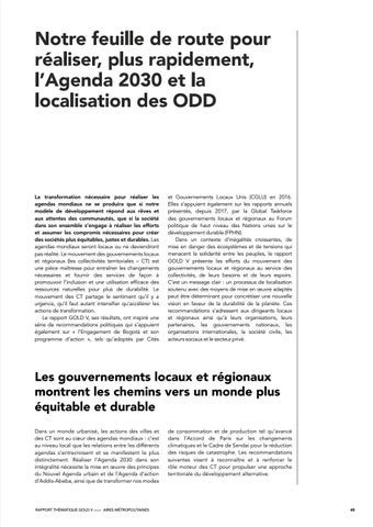 et Gouvernements Locaux Unis (CGLU) en 2016. Elles s’appuient également sur les rapports annuels présentés, depuis 2017, par la Global Taskforce des gouvernements locaux et régionaux au Forum politique de haut niveau des Nations unies sur le développement durable (FPHN). Dans un contexte d’inégalités croissantes, de mise en danger des écosystèmes et de tensions qui menacent la solidarité entre les peuples, le rapport GOLD V présente les efforts du mouvement des gouvernements locaux et régionaux au service des collectivités, de leurs besoins et de leurs espoirs. C’est un message clair : un processus de localisation soutenu avec des moyens de mise en œuvre adaptés peut être déterminant pour concrétiser une nouvelle vision en faveur de la durabilité de la planète. Ces recommandations s’adressent aux dirigeants locaux et régionaux ainsi qu’à leurs organisations, leurs partenaires, les gouvernements nationaux, les organisations internationales, la société civile, les acteurs sociaux et le secteur privé.
