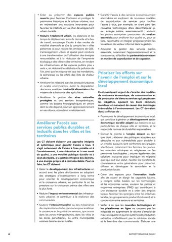Prioriser les efforts sur l'avenir de l'emploi et sur le développement économique local Il est maintenant urgent de s’écarter des modèles de croissance économique, de consommation et de production de biens et services qui perpétuent les inégalités, épuisent les biens communs mondiaux et menacent de causer des dommages irréversibles à l’environnement. Les CT devraient donc s’efforcer de : • Promouvoir le développement économique local, qui contribue à générer un développement socioéconomique durable adapté aux besoins et aux particularités de chaque ville et territoire, et le respect de normes de durabilité responsables. • Donner la priorité à l’emploi décent, en tant que droit ; élaborer des politiques adaptées aux obstacles et aux vulnérabilités pour accéder à un emploi auxquels sont confrontés des groupes spécifiques, notamment les femmes, les jeunes, les minorités ethniques et religieuses ou les personnes handicapées ; trouver également des solutions inclusives pour impliquer les migrants quel que soit leur statut ; faciliter les transferts de connaissances entre générations pour préserver, diffuser et développer le savoir-faire et la production locale.