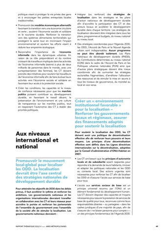 • Intégrer (ou renforcer) des stratégies de localisation dans les stratégies et les plans d’action nationaux de développement durable afin d’accroître la participation des CT et des acteurs locaux et accélérer le développement durable dans chaque territoire. Les stratégies de localisation devraient être intégrées dans tous les plans, programmes et budgets, du niveau national au niveau local. • Des stratégies coordonnées pour l’Agenda 2030, les ODD, l’Accord de Paris et le Nouvel Agenda urbain sont indispensables. Aucun programme ne peut être abordé isolément. Les Plans nationaux de développement durable (PNDD), les Contributions déterminées au niveau national (CDN) dans le cadre de l’Accord de Paris et les Politiques urbaines nationales (PUN) ainsi que d’autres plans stratégiques doivent être mieux coordonnés afin de surmonter les stratégies sectorielles fragmentées, d’améliorer l’allocation des ressources et de stimuler la mise en œuvre à tous les niveaux de gouvernance, du mondial au local et vice versa.