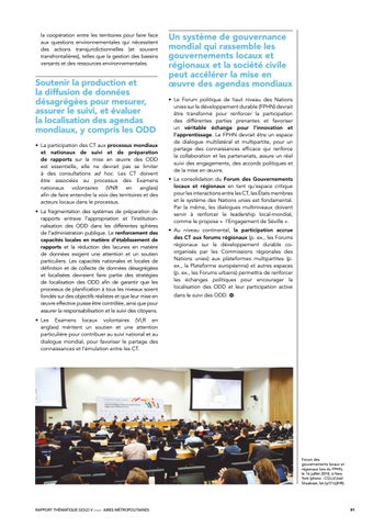 Un système de gouvernance mondial qui rassemble les gouvernements locaux et régionaux et la société civile peut accélérer la mise en œuvre des agendas mondiaux • Le Forum politique de haut niveau des Nations unies sur le développement durable (FPHN) devrait être transformé pour renforcer la participation des différentes parties prenantes et favoriser un véritable échange pour l'innovation et l'apprentissage. Le FPHN devrait être un espace de dialogue multilatéral et multipartite, pour un partage des connaissances efficace qui renforce la collaboration et les partenariats, assure un réel suivi des engagements, des accords politiques et de la mise en œuvre. • La consolidation du Forum des Gouvernements locaux et régionaux en tant qu'espace critique pour les interactions entre les CT, les États membres et le système des Nations unies est fondamental. Par la même, les dialogues multiniveaux doivent servir à renforcer le leadership local-mondial, comme le propose « l'Engagement de Séville ». • Au niveau continental, la participation accrue des CT aux forums régionaux (p. ex., les Forums régionaux sur le développement durable coorganisés par les Commissions régionales des Nations unies) aux plateformes multipartites (p. ex., la Plateforme européenne) et autres espaces (p. ex., les Forums urbains) permettra de renforcer les échanges politiques pour encourager la localisation des ODD et leur participation active dans le suivi des ODD.
