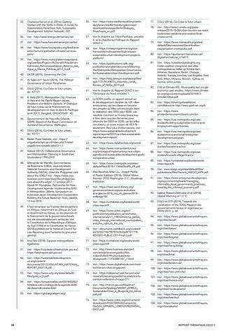 58. Voir : https://citiesprogramme.org/ourframework/multi-partner-high-impactsustainable-urban-development-projectsplatform/. 59. Voir : https://publications.iadb.org/ publications/english/document/Steeringthe-Metropolis-Metropolitan-Governancefor-Sustainable-Urban-Development.pdf. 60. Voir : https://sdg.lamayor.org/sites/g/files/ wph1131/f/LA%27s_Voluntary_Local_ Review_of_SDGs_2019.pdf. 61. Voir le chapitre du Rapport GOLD V sur l’Amérique du Nord, encadré 1. 62. Le SDSN publie un rapport annuel sur le développement durable de 105 villes américaines, qui les classe en fonction des progrès qu’elles ont accomplis dans la réalisation des ODD pour 2030. Les résultats montrent qu’il reste beaucoup à faire dans tous les domaines pour atteindre les ODD en 2030, car les villes ont obtenu un score moyen de 48,9 % seulement. Pour plus d’informations, voir : https://www.sustainabledevelopment. report/reports/2019-us-cities-sustainabledevelopment-report/. 63. Voir : https://www.dataforcities.org/wccd/. 64. Voir : https://www.mistraurbanfutures. org/en/project/implementing-new-urbanagenda-and-sustainable-development-goalscomparative-urban. 65. Voir : https://www.metropolis.org/sites/ default/files/2018-11/MetObsIP6_FR.pdf. 66. Max Bouchet, Sifan Liu, Joseph Parilla et Nader Kabbani (2018), Global Metro Monitor 2018, Washington D.C., Brookings Institution. 67. Voir : https://read.oecd-ilibrary.org/ governance/oecd-regions-and-citiesat-a-glance-2018_reg_cit_glance-2018en#page102. 68. Voir : https://unhabitat.org/books/worldcities-report/#. 69. Voir : https://www.cidob.org/en/ publications/publication_series/notes_ internacionals/n1_198/rethinking_global_ cities_through_international_municipalism_ and_the_right_to_the_city. 70. Voir : documents.worldbank.org/curated/ en/323321467987876242/pdf/101718REVISED-PUBLIC-CP1-Final-2.pdf.