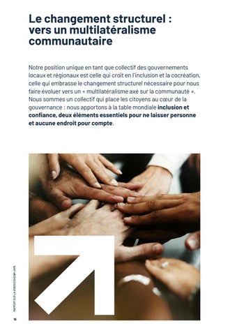Notre position unique en tant que collectif des gouvernements locaux et régionaux est celle qui croit en l’inclusion et la cocréation, celle qui embrasse le changement structurel nécessaire pour nous faire évoluer vers un « multilatéralisme axé sur la communauté ». Nous sommes un collectif qui place les citoyens au cœur de la gouvernance : nous apportons à la table mondiale inclusion et confiance, deux éléments essentiels pour ne laisser personne et aucune endroit pour compte.