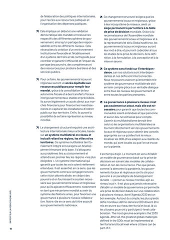 Ce changement structurel exigera que les gouvernements locaux et régionaux, grâce à leur écosystème de réseaux, aient un siège permanent à part entière à la table de prise de décision mondiale. Grâce à la reconnaissance de l’Assemblée mondiale des gouvernements locaux et régionaux et à la représentativité de la Global taskforce, les gouvernements locaux et régionaux auront leur mot à dire, et pourront codécider à tous les stades de la prise de décision, de la définition, à la formulation, à la conception et à la mise en œuvre. Ce système sera fondé sur l’interdépendance, car nos solutions sont interdépendantes et nos défis sont interconnectés. Nous ne pouvons avancer qu’ensemble et le système de gouvernance multilatérale doit en tenir compte grâce à un véritable dialogue entre tous les niveaux de gouvernement et entre toutes les parties prenantes. La gouvernance à plusieurs niveaux n’est pas seulement un atout, mais elle est nécessaire pour garantir que toutes les communautés soient entendues et que personne et aucun lieu ne soit laissé pour compte. L’avenir du multilatéralisme devrait être celui où les organisations multilatérales se tournent directement vers les gouvernements locaux et régionaux pour obtenir des conseils appropriés sur ce qu’elles font le mieux : localiser les ODD et les adapter aux réalités du monde, qui sont locales où que l’on se trouve sur la planète. Il est temps d’agir. Le moment est venu d’établir un modèle de gouvernance basé sur la prise de décisions en suivant des modèles de collaboration et non de concurrence. Plus que jamais, comme l’a démontré la pandémie, les gouvernements locaux et régionaux sont la clé pour parvenir à un paradigme de développement durable : « penser au niveau mondial, agir au niveau local ». Il est plus que jamais nécessaire d’établir un modèle de gouvernance qui permette une prise de décision basée sur une collaboration à plusieurs niveaux, dont l’Agenda 2030 est un bon exemple. Au bout du compte, les plus grands défis mondiaux définis dans les ODD doivent être mis en œuvre au niveau territorial et local, là où les citoyens pourront y participer.ti-level collaboration. The most genuine example is the 2030 Agenda. After all, the greatest global challenges defined in the SDGs must be implemented at territorial and local level where citizens can be part of it.