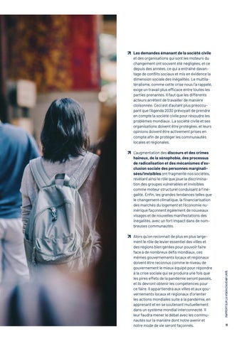 Les demandes émanant de la société civile et des organisations qui sont les moteurs du changement ont souvent été négligées, et ce depuis des années, ce qui a entraîné davantage de conflits sociaux et mis en évidence la dimension sociale des inégalités. Le multilatéralisme, comme cette crise nous l’a rappelé, exige un travail plus efficace entre toutes les parties prenantes. Il faut que les différents acteurs arrêtent de travailler de manière cloisonnée. Ceci est d’autant plus préoccupant que l’Agenda 2030 prévoyait de prendre en compte la société civile pour résoudre les problèmes mondiaux. La société civile et ses organisations doivent être protégées, et leurs opinions doivent être activement prises en compte afin de protéger les communautés locales et régionales.