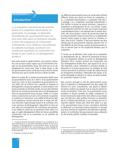 Les différents gouvernements locaux du monde entier utilisent différents termes pour décrire les formes de coopération, p. ex., « coopération décentralisée », « coopération ville-ville », « jumelage » ou « coopération municipale internationale ». Pour faciliter la lecture du présent document, l’expression « coopération au développement des GL » est utilisée ci-après. Il est également important de noter que lorsque l’expression « gouvernements locaux » est employée dans le présent document, elle inclut plusieurs niveaux de gouvernance allant de la commune (premier niveau) à la province ou au département (second niveau) jusqu’à la région (second ou troisième niveau, selon le cas). Toutefois, il faut aussi observer que dans certains pays les gouvernements régionaux peuvent avoir un rôle différent de celui d’autres niveaux de gouvernements locaux et peuvent jouer le rôle d’organisme donateur pour la coopération. Il n’existe pas de définition claire unique de la coopération au développement des GL. L’Accord de partenariat de Busan pour une coopération efficace au service du développement (décembre 2011)3 souligne plusieurs des composantes clés d’un développement durable réussi, dans lequel les GL ont un rôle important à jouer, notamment la croissance durable, la démocratie et la bonne gouvernance, les stratégies de lutte contre la pauvreté et la protection sociale. Des enjeux tels que les changements climatiques, l’atténuation des risques, la sécurité individuelle et collective, la culture, les droits humains, etc. pourraient s’ajouter à la liste. Nous pouvons envisager le rôle des gouvernements locaux dans la coopération au développement sous deux angles très distincts et à priori contradictoires. Cela ajoute un élément de tension créatrice qui apparaît tout au long du présent document d’orientation. D’une part, les gouvernements locaux possèdent et doivent posséder de solides compétences en termes d’autonomie locale et CGLU doit veiller à ce que chaque pays soit doté d’un cadre juridique favorisant la coopération des GL à l’échelle internationale, ce qui constitue pour lui un important objectif. D’autre part, CGLU doit veiller à ce que, si les gouvernements locaux et leurs associations cherchent et obtiennent un financement externe important et croissant pour leurs activités de coopération internationale au développement, la contribution des gouvernements locaux débouche sur des résultats positifs, rentables et mesurables.