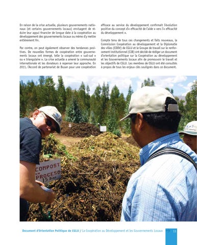efficace au service du développement confirmait l’évolution positive du concept d’« efficacité de l’aide » vers l’« efficacité du développement ». Compte tenu de tous ces changements et faits nouveaux, la Commission Coopération au développement et la Diplomatie des villes (CDDV) de CGLU et le Groupe de travail sur le renforcement institutionnel (CIB) ont décidé de rédiger un document d’orientation politique sur la Coopération au développement et les Gouvernements locaux afin de promouvoir le travail et les objectifs de CGLU. Les membres de CGLU ont été consultés à propos de tous les enjeux clés soulignés dans ce document.