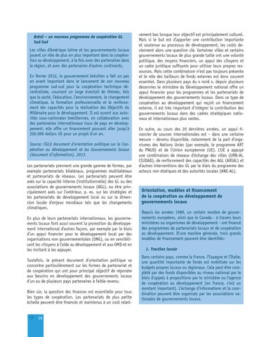 Brésil – un nouveau programme de coopération GL Sud-Sud Les villes d’Amérique latine et les gouvernements locaux jouent un rôle de plus en plus important dans la coopération au développement, à la fois avec des partenaires dans la région, et avec des partenaires d’autres continents. En février 2012, le gouvernement brésilien a fait un pas en avant important dans le lancement de son nouveau programme sud-sud pour la coopération technique décentralisée, couvrant un large éventail de thèmes, tels que la santé, l’éducation, l’environnement, le changement climatique, la formation professionnelle et le renforcement des capacités pour la réalisation des Objectifs du Millénaire pour le développement. Il est ouvert aux autorités sous-nationales brésiliennes, en collaboration avec des partenaires internationaux issus de pays en développement; elle offre un financement pouvant aller jusqu’à 200.000 dollars US pour un projet d’un an. Source: CGLU document d’orientation politique sur la Coopération au développement et les Gouvernements locaux (document d’information), 2013. Les partenariats prennent une grande gamme de formes, par exemple partenariats bilatéraux, programmes multilatéraux et partenariats de réseaux. Les partenariats peuvent être axés sur la capacité interne (institutionnelle) des GL ou des associations de gouvernements locaux (AGL), ou être principalement axés sur l’extérieur, p. ex. sur les stratégies et les partenariats de développement local ou sur la dimension locale d’enjeux mondiaux tels que les changements climatiques. En plus de leurs partenariats internationaux, les gouvernements locaux font aussi souvent la promotion du développement international d’autres façons, par exemple par le biais d’un appui financier pour le développement local par des organisations non gouvernementales (ONG), ou en sensibilisant les citoyens à l’aide au développement et aux OMD et en les incitant à les appuyer. Toutefois, le présent document d’orientation politique se concentre particulièrement sur les formes de partenariat et de coopération qui ont pour principal objectif de répondre aux besoins en développement des gouvernements locaux d’un ou de plusieurs pays partenaires à faible revenu. Bien sûr, la question des finances est essentielle pour tous les types de coopération. Les partenariats de plus petite échelle peuvent être financés et maintenus à un coût relati-