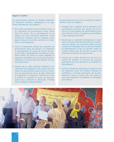 Appel à l’action Les gouvernements nationaux, les donateurs bilatéraux, les institutions financières multilatérales et les organismes internationaux sont appelés à : • Reconnaître davantage les gouvernements locaux et les associations de gouvernements locaux comme étant des acteurs clés du développement et les appuyer pour qu’ils participent pleinement, soient consultés et s’engagent dans les dialogues stratégiques nationaux et sectoriels portant sur la coopération au développement ; • Fournir un financement suffisant pour permettre aux gouvernements locaux de participer à la coopération au développement. On propose de réserver 20 pourcent de l’aide au développement international (actuellement offerte sous forme de soutien budgétaire et d’approches sectorielles) pour les processus de décentralisation et de renforcement des capacités des gouvernements locaux ; • S’assurer que les cadres juridiques habilitants et les mécanismes des programmes sont en place pour permettre aux gouvernements locaux et/ou aux associations de gouvernements locaux de gérer directement les programmes de coopération internationale visant à: renforcer les capacités du secteur des gouvernements locaux, promouvoir la démocratie à l’échelle locale et appuyer la décentralisation ;