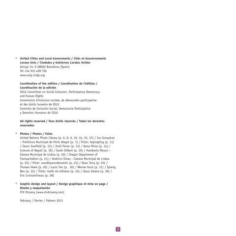 © United Cities and Local Governments / Cités et Gouvernements Locaux Unis / Ciudades y Gobiernos Locales Unidos Avinyó 15, E–08002 Barcelona (Spain) Tel +34 933 428 750 www.uclg-cisdp.org Coordination of the edition / Coordination de l’édition / Coordinación de la edición UCLG Committee on Social Inclusion, Participatory Democracy and Human Rights Commission d’inclusion sociale, de démocratie participative et des droits humains de CGLU Comisión de Inclusión Social, Democracia Participativa y Derechos Humanos de CGLU All rights reserved / Tous droits réservés / Todos los derechos reservados © Photos / Photos / Fotos United Nations Photo Library (p. 6, 8, 9, 10, 34, 35, 37) / Ivo Gonçalves – Prefeitura Municipal de Porto Alegre (p. 7) / Flickr: hepingting (p. 11) / Jason Samfield (p. 12) / Jordi Ferrer (p. 13) / Asma Mirza (p. 14) / Comune di Napoli (p. 18) / Sarah Gilbert (p. 19) / Humberto Mouco – Câmara Municipal de Lisboa (p. 20) / Oregon Department of Transportation (p. 21) / Américo Simas - Câmara Municipal de Lisboa (p. 22) / Flickr: woodleywonderworks (p. 23) / Dean Terry (p. 25) / Thomas Hawk (p. 26) / Louis Tan (p. 30) / Werner Kunz (p. 31) / Spreng Ben (p. 32) / Flickr: malik ml williams (p. 33) / Jesus Solana (p. 36) / Eric Constantineau (p. 38) © Graphic design and layout / Design graphique et mise en page / Diseño y maquetación STV Disseny (www.stvdisseny.com) February / Février / Febrero 2013