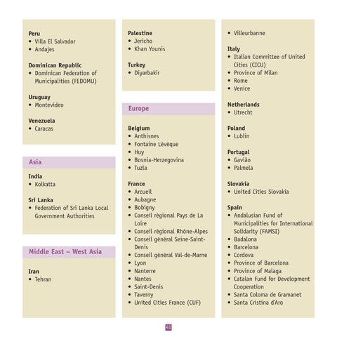 Spain • Andalusian Fund of Municipalities for International Solidarity (FAMSI) • Badalona • Barcelona • Cordova • Province of Barcelona • Province of Malaga • Catalan Fund for Development Cooperation • Santa Coloma de Gramanet • Santa Cristina d’Aro