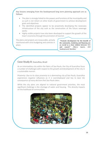 Case Study 8: Guarulhos, Brazil As an intermediary city within the fabric of Sao Paulo, the City of Guarulhos faces a number of challenges with respect to the growth and development of the city in a sustainable manner. Proximity: Due to its close proximity to a dominating city of Sao Paulo, Guarulhos experiences negative influences as it is overshadowed and has to bear the consequence of every decision that Sao Paulo takes. While the city plans are aligned to national government priorities, the most significant challenge is the shortage of water and housing. This directly impacts on the livelihood of communities.