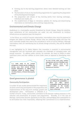 Environmental and Climate Change KwaDukuza is a municipality severely threatened by climate change. Along the coastline, many settlements of rich communities are under risk and investments to reinforce infrastructures are questions over the long term. In the future, as a result of massive urbanisation, intermediary cities must be prepared to mitigate and adapt to climate change. African cities are urbanising rapidly and have the most vulnerable people that need to be considered in terms of service delivery. Although intermediary cities are contributing less to climate change emissions, they will be affected the most. It was highlighted by Dr Debra Roberts that innovation is essential in environmental management and she illustrated with examples the challenges of managing water and energy resources. To address water scarcity, for example, we need to relook at water catchment areas and their abilities to serve wider areas as opposed to developing more dams.