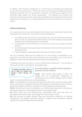 Political Maturity It is common practice in many intermediary cities for plans to be extensively modified from one political term to the next. This results in at least the following:
