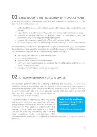 01 BACKGROUND TO THE PREPARATION OF THE POLICY PAPER A learning exchange on intermediary cities was held in KwaDukuza in March 2013. The purpose of the workshop was to: